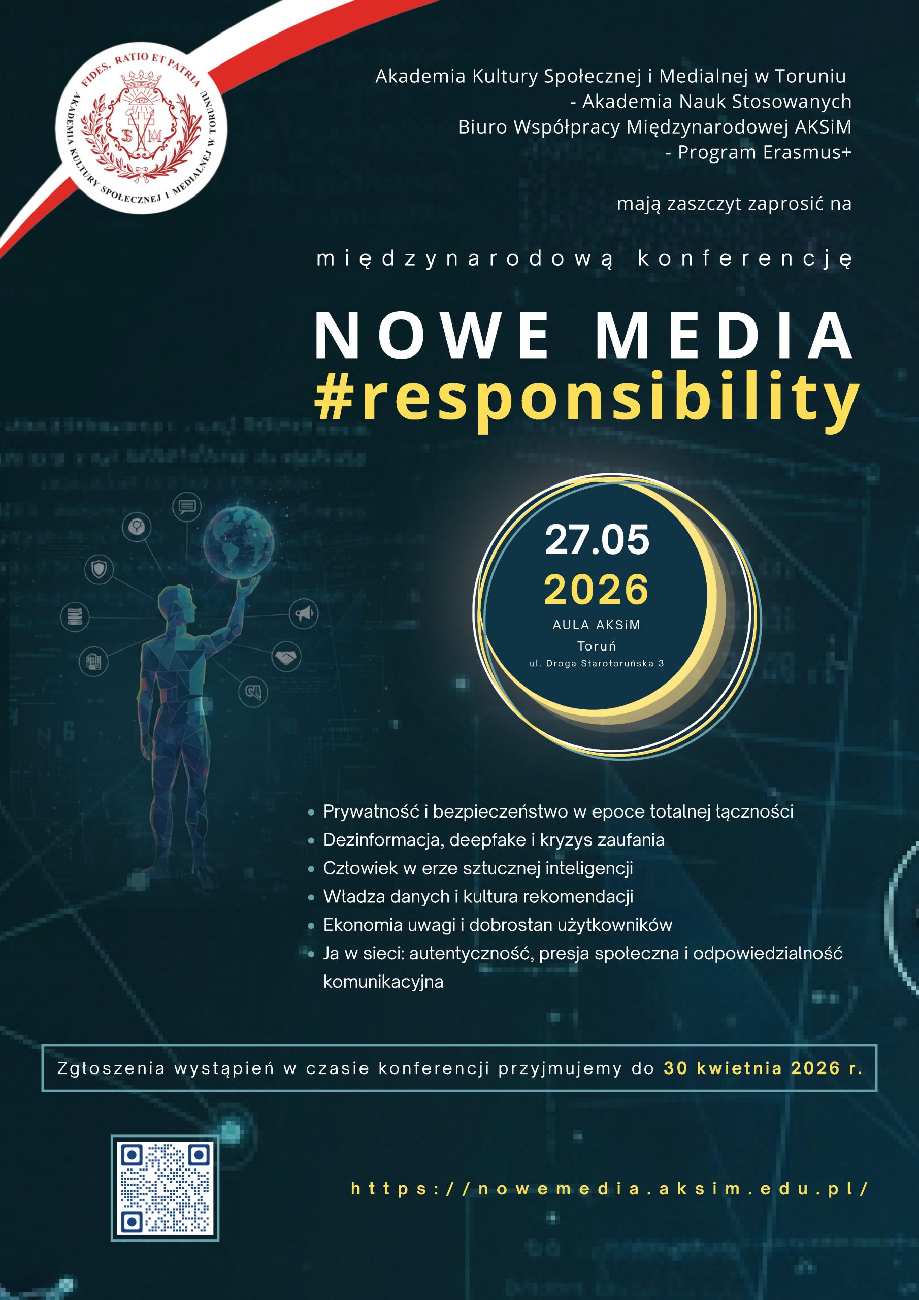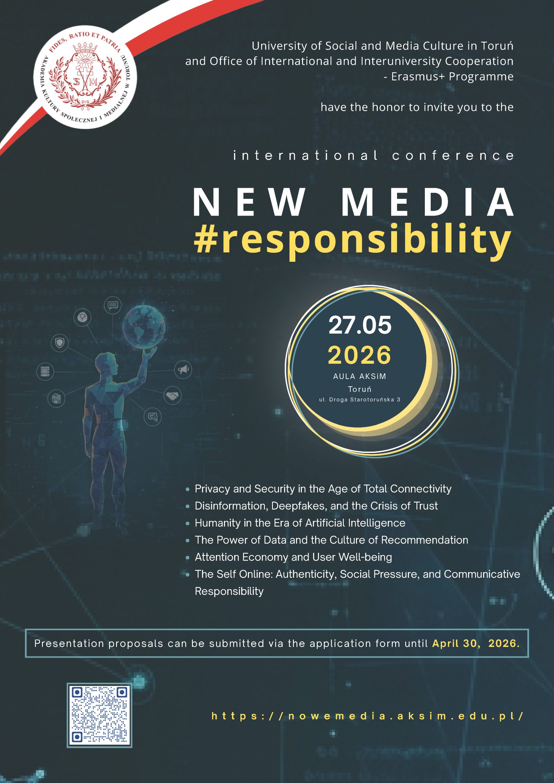 Konferencja Nowe Media #responsibility jest przestrzenią interdyscyplinarnej refleksji nad odpowiedzialnością w komunikacji cyfrowej – zarówno w wymiarze technologicznym, społecznym, jak i etycznym. Celem spotkania jest analiza wyzwań związanych z rozwojem technologii medialnych oraz poszukiwanie rozwiązań sprzyjających budowaniu odpowiedzialnego, bezpiecznego i wiarygodnego środowiska komunikacyjnego.