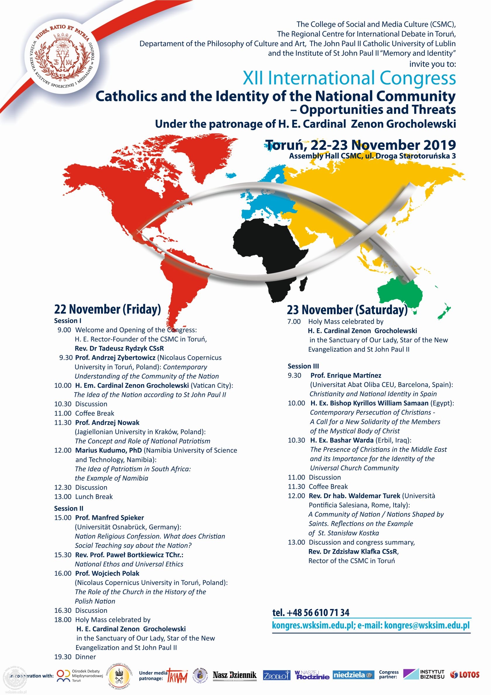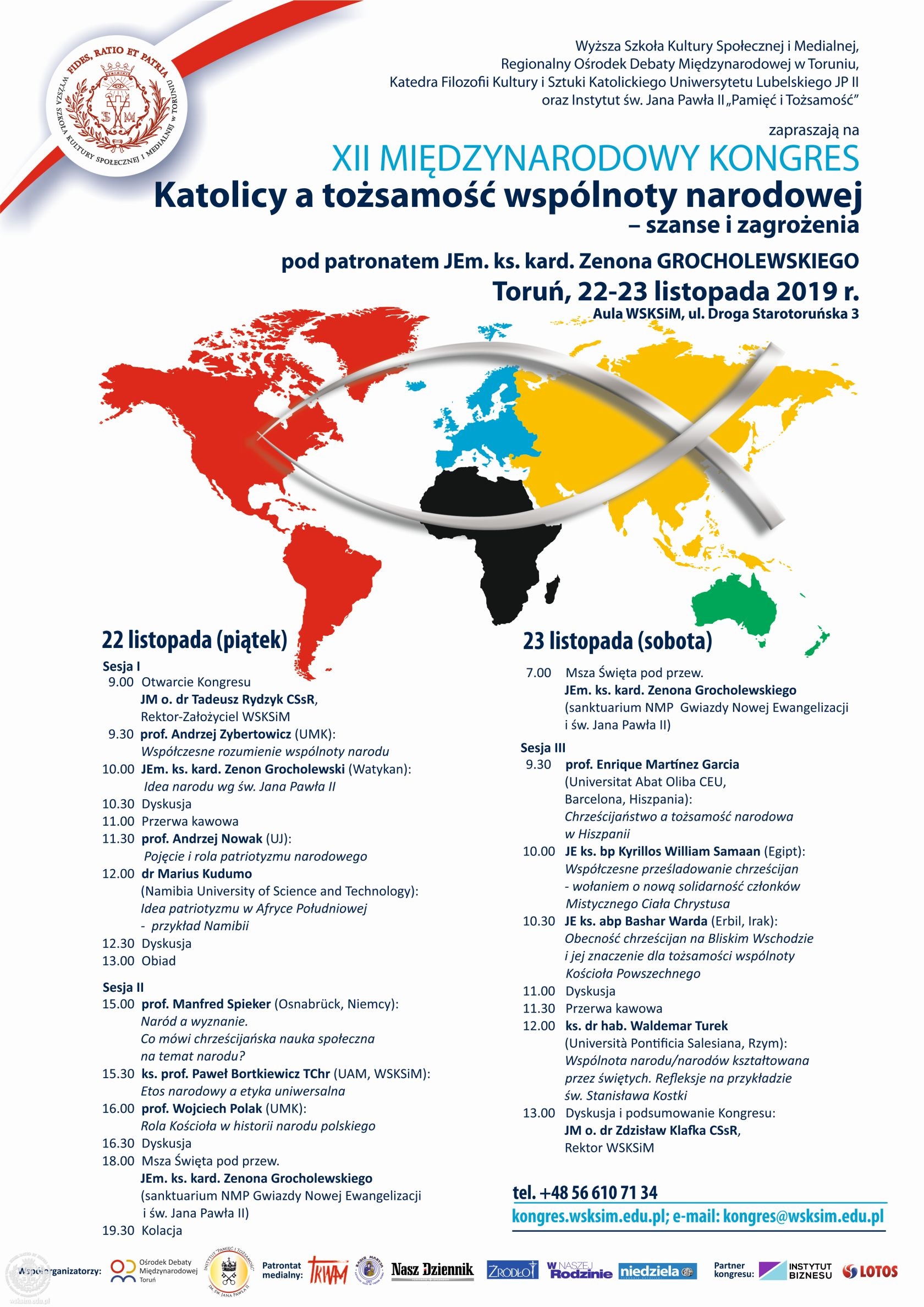 W Wyższej Szkole Kultury Społecznej i Medialnej zakończył się dwudniowy XII Międzynarodowy Kongres, odbywający się w tym roku pod hasłem „Katolicy a tożsamość wspólnoty narodowej – szanse i zagrożenia”. Patronat nad wydarzeniem objął Jego Eminencja ks. kard. Zenon Grocholewski, Prefekt Senior Kongregacji Wychowania Katolickiego.