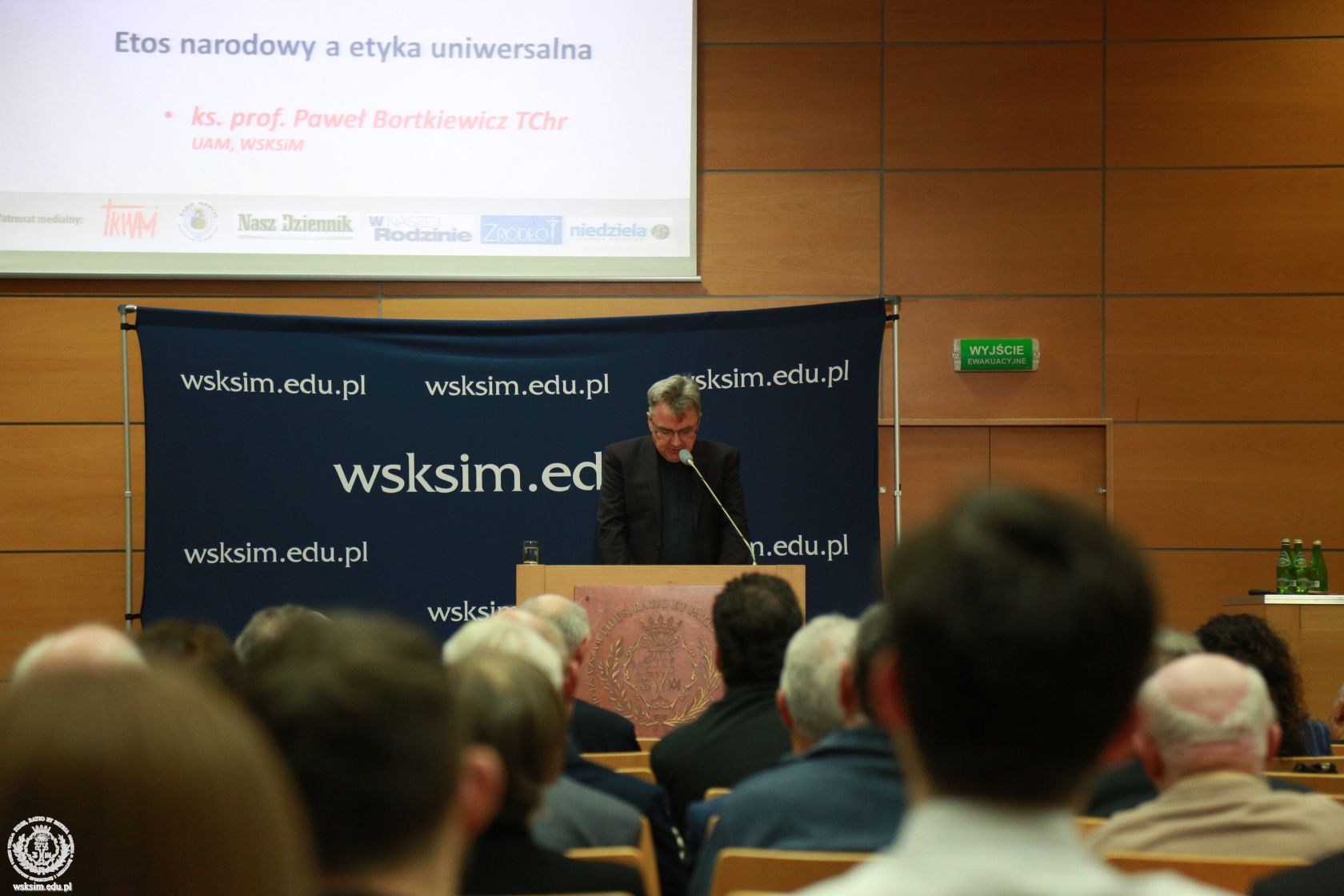 Kolejnym prelegentem był ks. prof. Paweł Bortkiewicz. Wygłosił on wykład pod tytułem: „Etos narodowy a etyka uniwersalna”. Prelegent zaznaczył, że etos jest sposobem bytowania człowieka. Z kolei podstawą bytowania jest kultura. W swoim wykładzie Ksiądz Profesor nawiązywał m.in. do dziedzictwa św. Jana Pawła II i wieszczów narodowych, w tym Cypriana Kamila Norwida. Tłumaczył, czym jest etos narodowy w odniesieniu do polskości i przypomniał wartości, które z etosu wynikały.