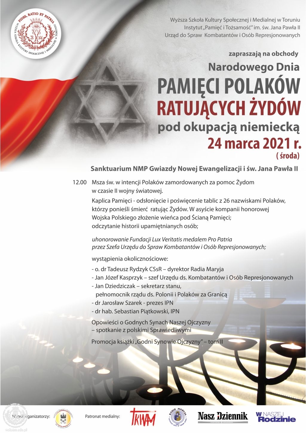 „Dzisiejsze uroczystości to niezwykle ważny wkład w obronę naszej Ojczyzny przed manipulacjami i wypaczaniem” – te słowa skierował prezydent Andrzej Duda do uczestników obchodów IV Narodowego Dnia Pamięci Polaków Ratujących Żydów pod okupacją niemiecką. Uroczystości odbyly się w Sanktuarium NMP Gwiazdy Nowej Ewangelizacji i św. Jana Pawła II w Toruniu.