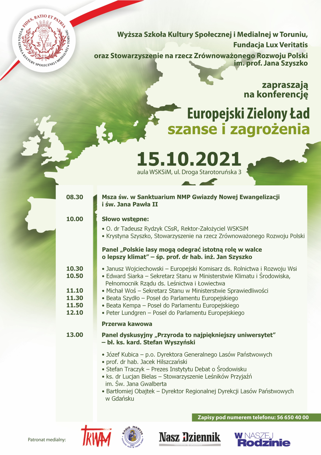 Konferencja Europejski Zielony Ład – szanse i zagrożenia była organizowana we współpracy Wyższej Szkoły Kultury Społecznej i Medialnej w Toruniu oraz Stowarzyszenia na rzecz Zrównoważonego Rozwoju Polski im. prof. Jana Szyszko.