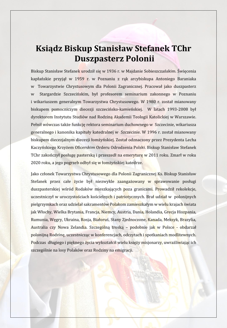 To właśnie posługa wśród rodaków mieszkających poza granicami jest charyzmatem Towarzystwa Chrystusowego. Ks. bp Stanisław Stefanek realizował go najpierw jako zakonnik, a później jako biskup, mocno biorąc sobie do serca przesłanie zostawione przez założyciela zgromadzenia – Sługę Bożego ks. kard. Augusta Hlonda.